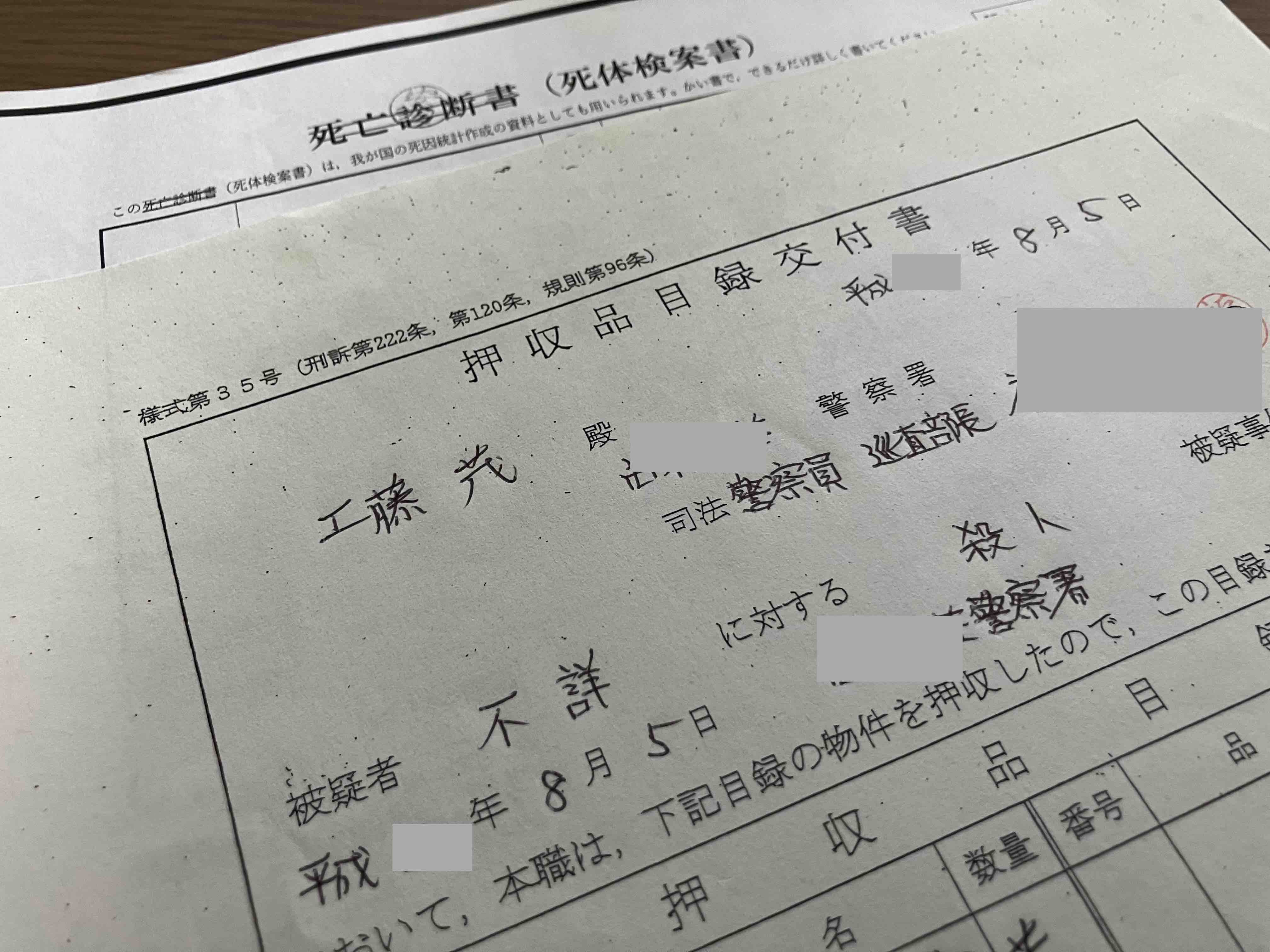 実際に交付された「押収品目録交付書」と「死体検案書」